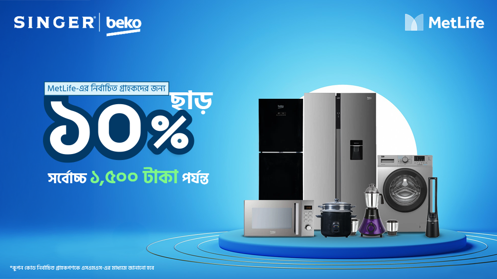 মেটলাইফের পলিসি কিনে উপভোগ করুন সিঙ্গার এর নির্বাচিত প্রোডাক্টের উপর ১০% (সর্বোচ্চ ১৫০০ টাকা) ছাড় ! প্রোডাক্ট লিস্টটি দেখতে ভিজিট করুন- https://urlyte.com/singer/metlife